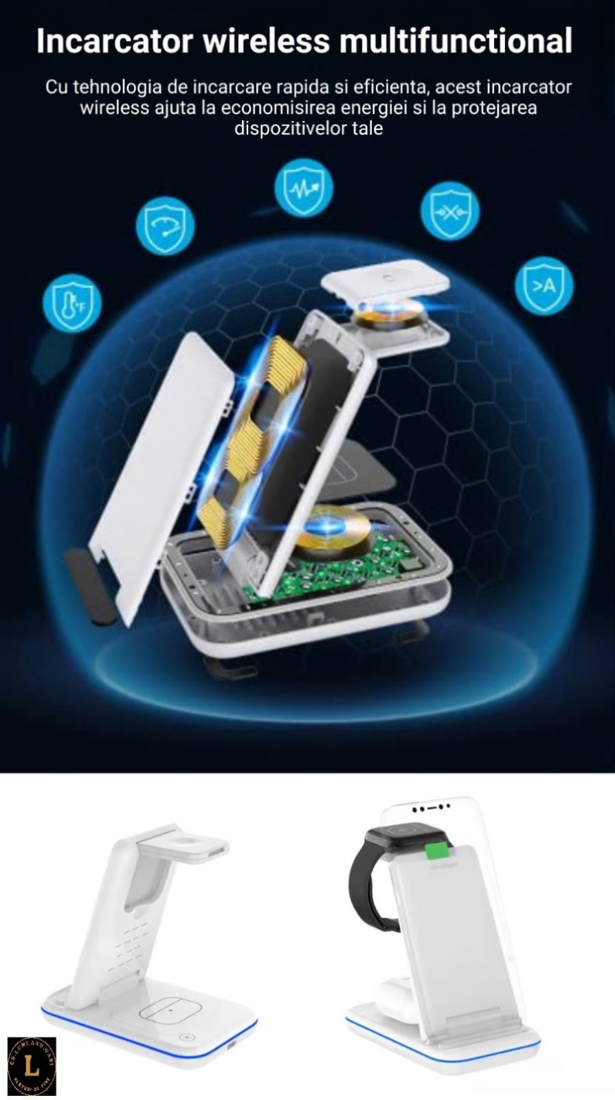 Cu acest incarcator wireless 3 in 1, poti incarca telefonul, smartwatch-ul si castile wireless simultan, eliminand nevoia de a folosi mai multe incarcatoare sau cabluri.