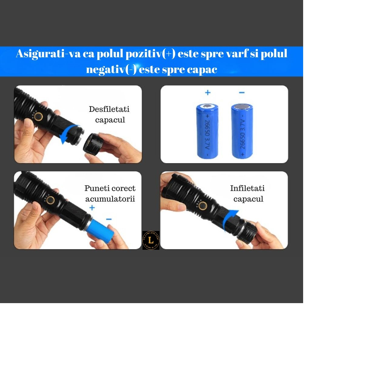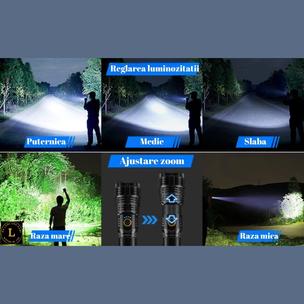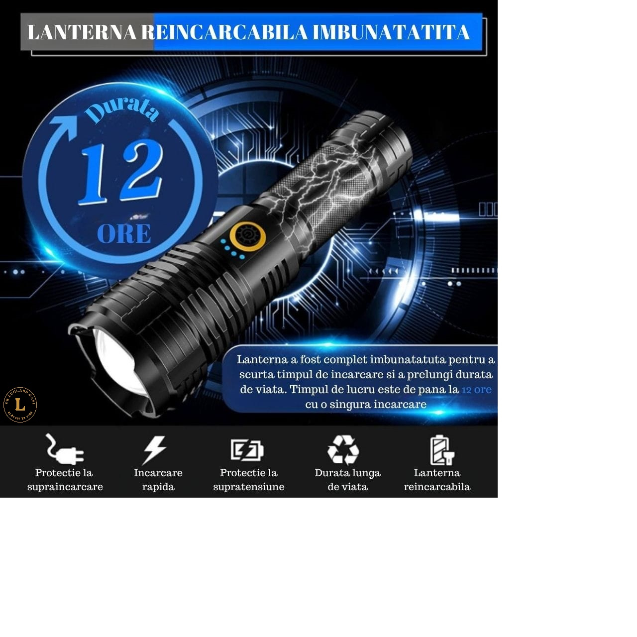 - Baterie reincarcabila si portabila: Lanterna vine cu o baterie de capacitate mare, usor de reincarcat, oferind autonomie extinsa pentru utilizare continua, fara grija inlocuirii constante a bateriilor.