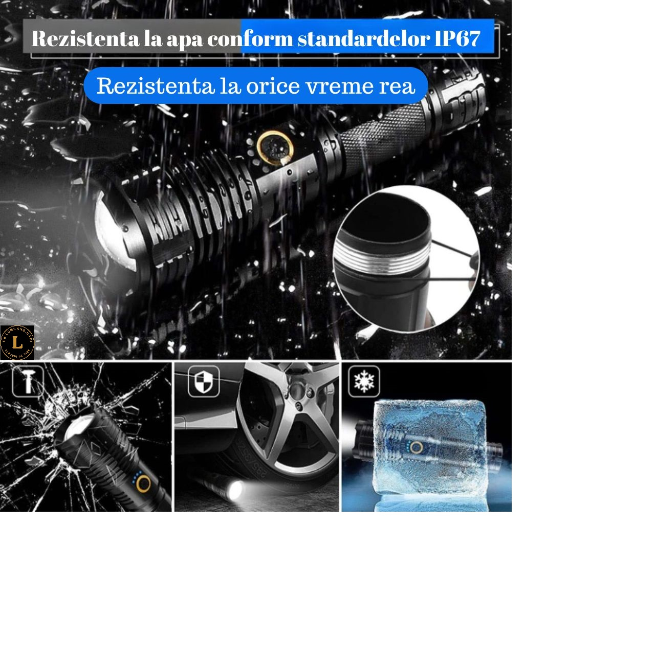 - Rezistenta la apa conform standardului IP67: Protectia IP67 asigura rezistenta totala la apa si praf, facand lanterna perfecta pentru orice conditii meteo. Poti avea incredere ca va functiona excelent chiar si in ploaie sau medii umede.